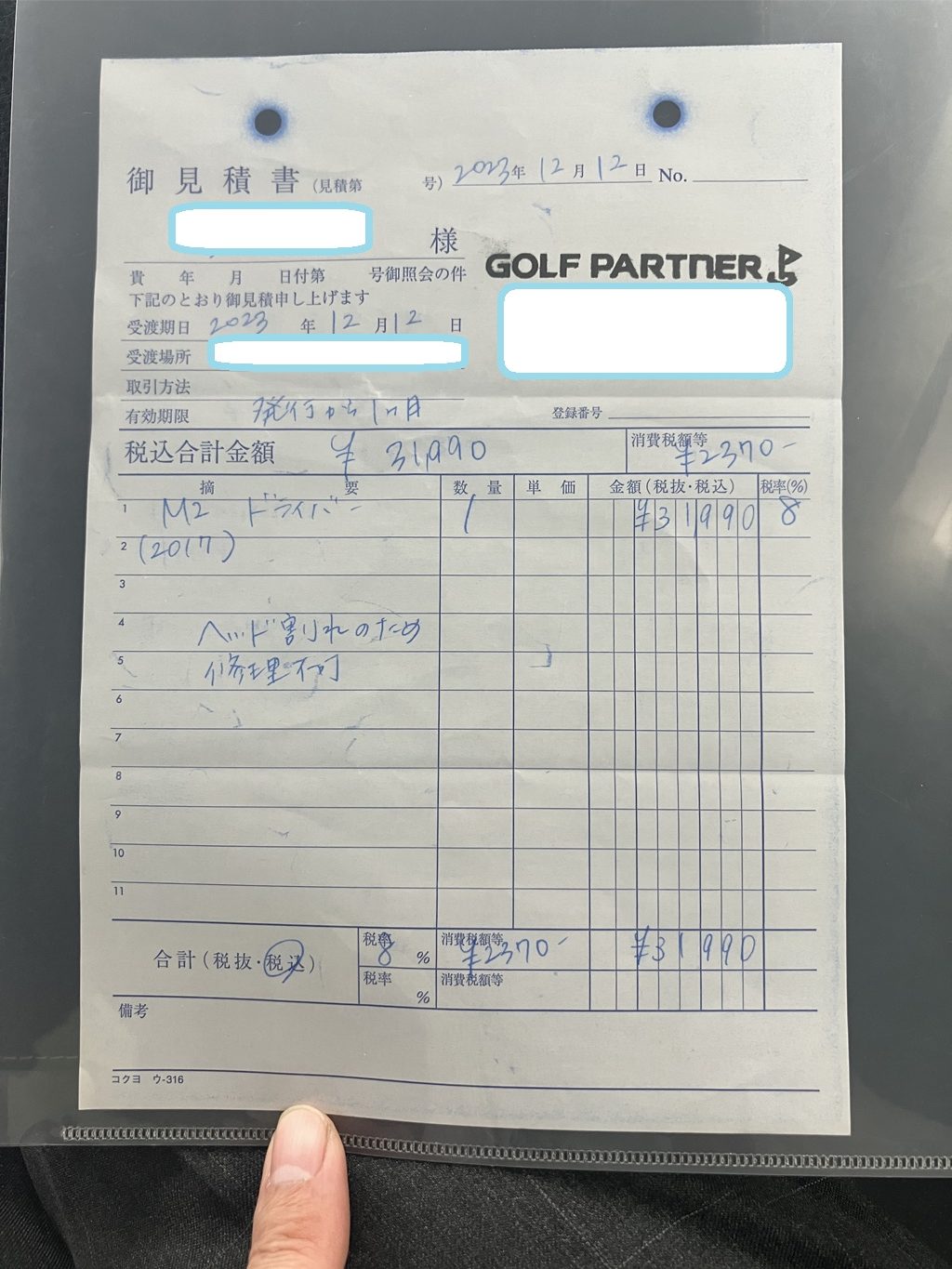 このあと、ゴルフ用品店(私の場合は、市内の中古屋さん)に、証明書を持ち込むと、このような破損見積りを発行して頂けます。証明書がないと見積書は作成してくれませんので注意してください!!
