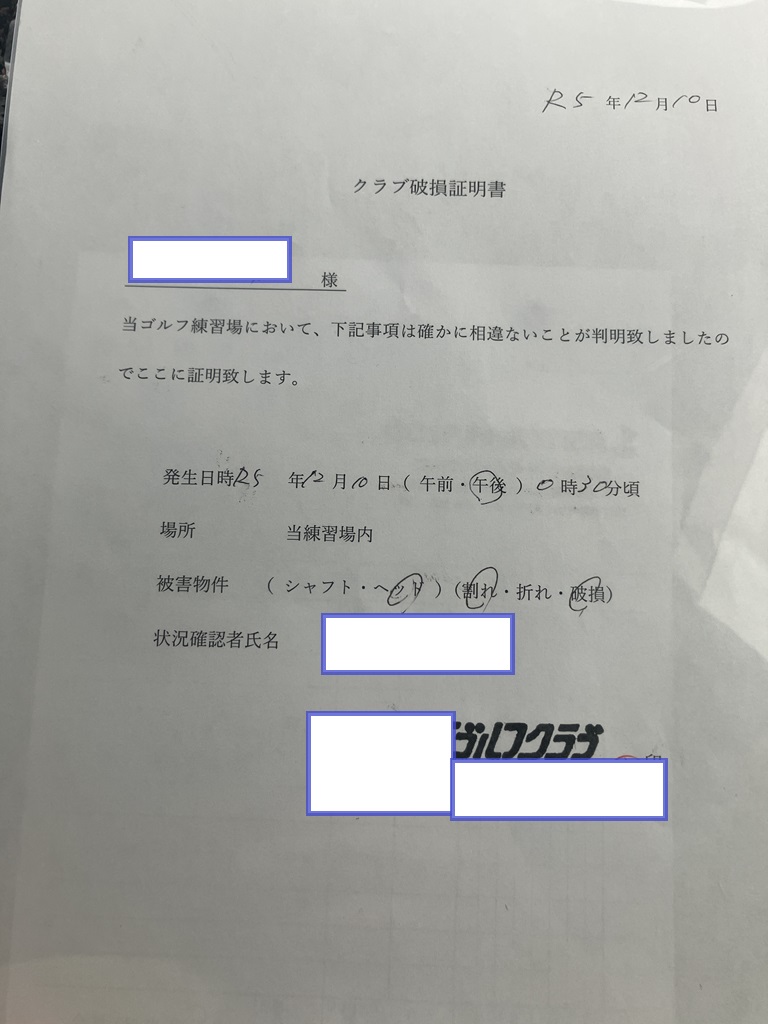 まずは、練習場、ゴルフ場にて、いつ、どこで、何を、壊したかの証明書を発行して頂きます。