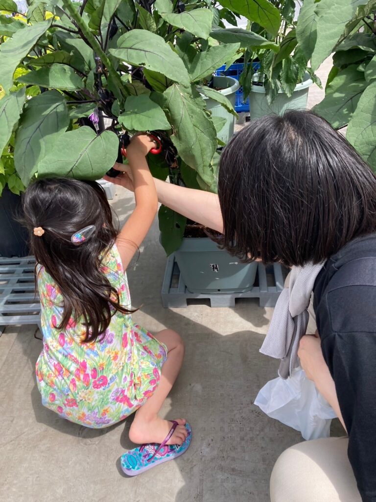 園芸部長の菜園でナスやピーマンの収穫体験も。