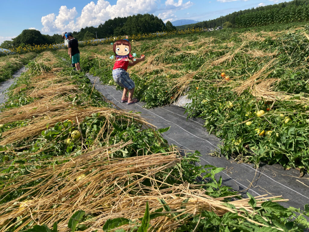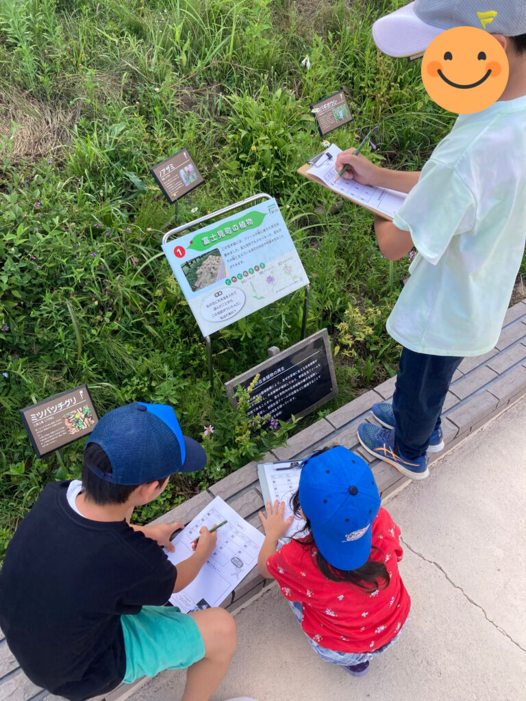 畑の周りでクイズラリーに参加し(真顔の子供達)、走り回り、笑顔いっぱい。