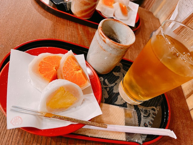 オレンジとパイナップルのフルーツ大福。もっちりとした大福にさっぱりとしたフルーツがマッチしていました。