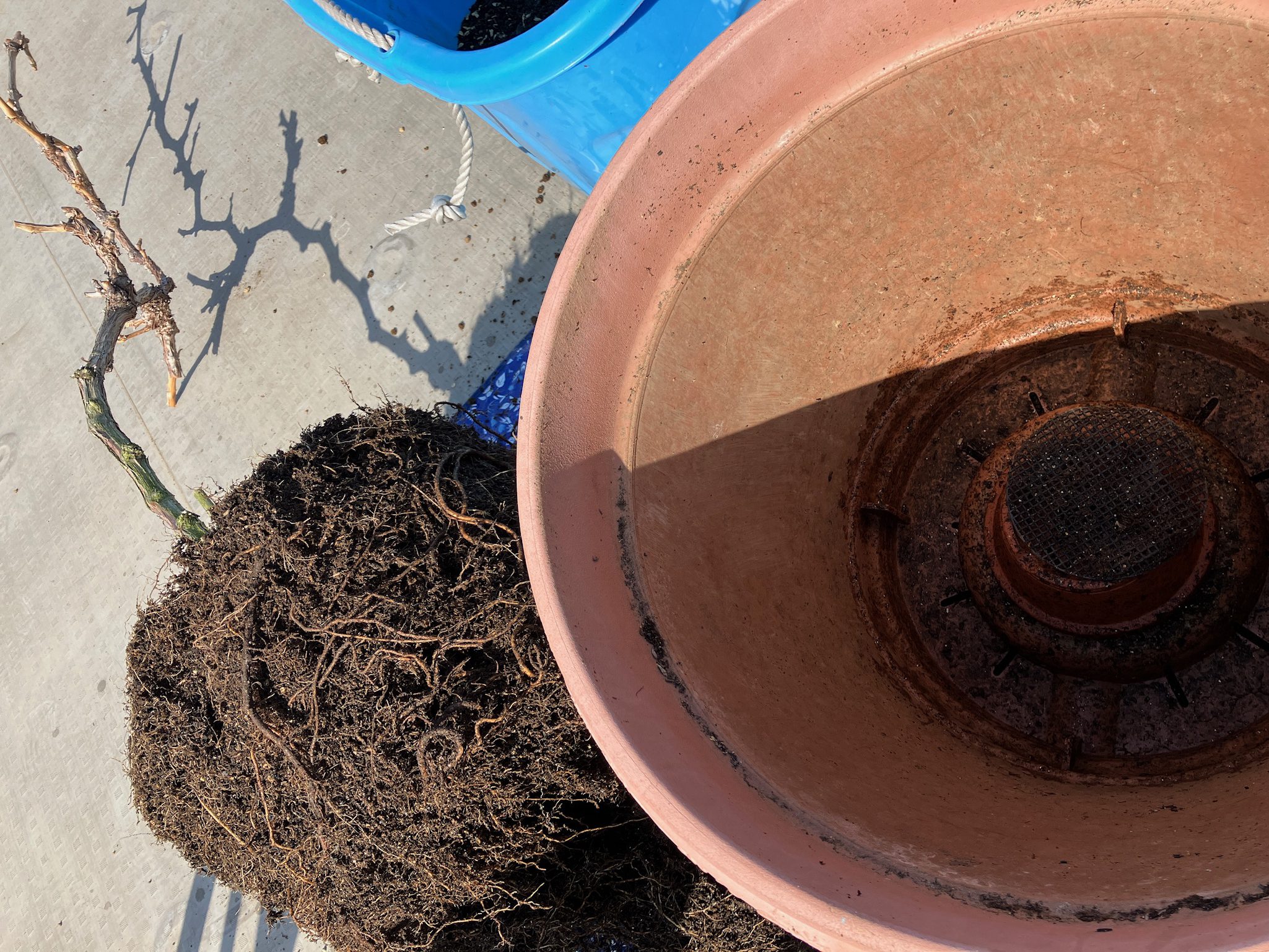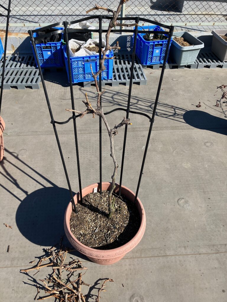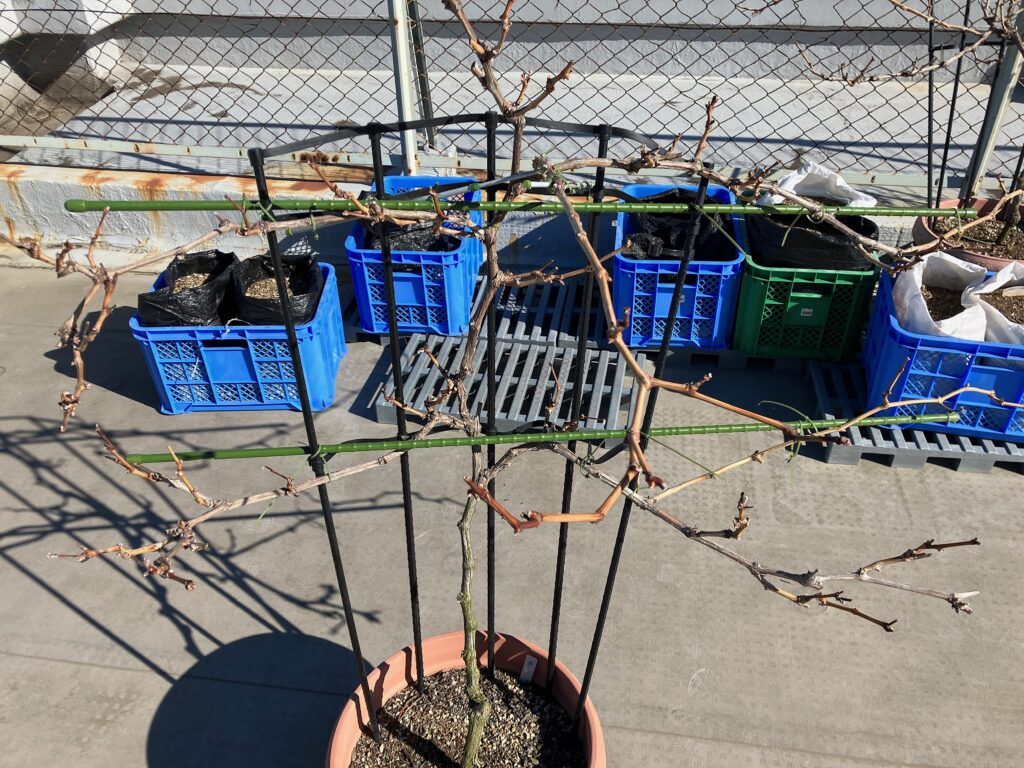手始めに屋上菜園で管理しているシャインマスカット・ブラックベリー・エルダーベリーの果樹4株の冬季剪定と植え替えを行いました。シャインマスカットは去年節を残し過ぎて枝が大暴れしてしまったので、今年はしっかりめに選定しました。