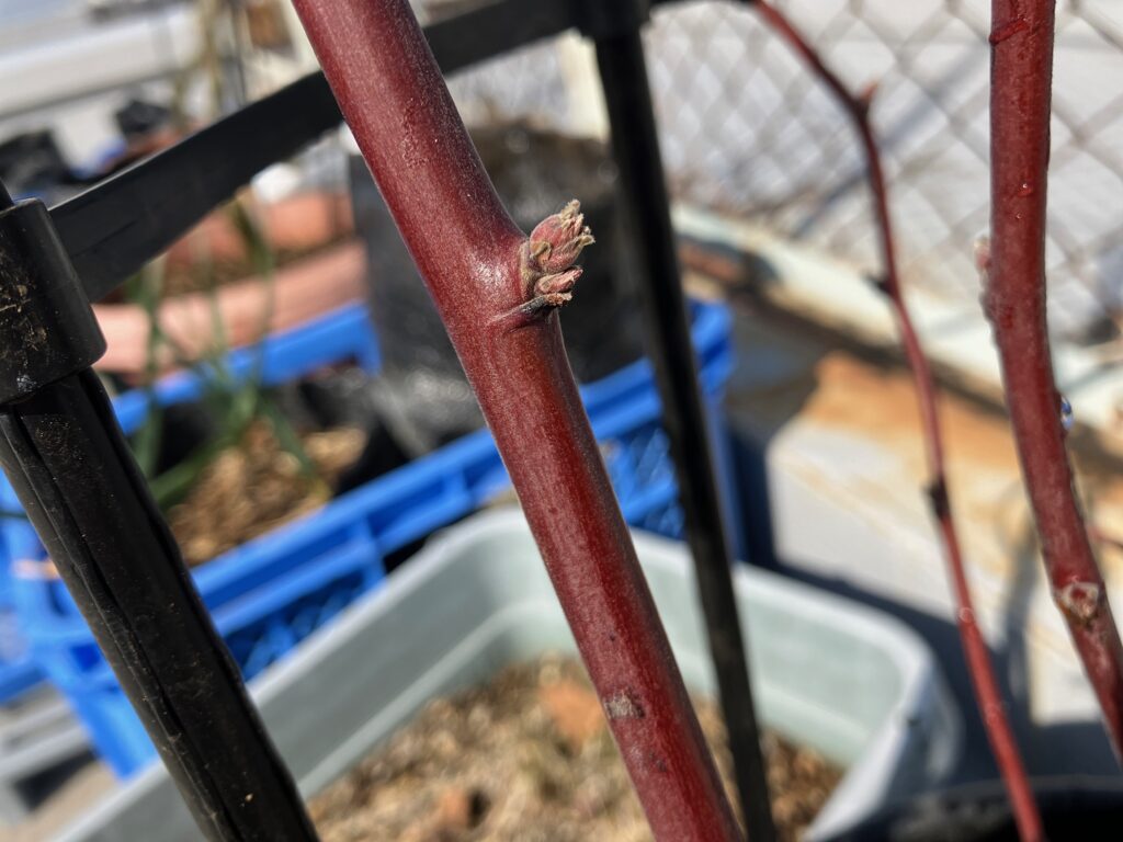 シャインマスカットは新芽が動き出すまでに一度消毒が必要なので、大急ぎでやらないといけなさそうですね…。お陰で毎週末忙しいですが、これも園芸の楽しみです。