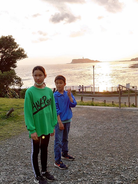 江ノ島と夕日をバックに鎌倉殿の2人が決めポーズ。
